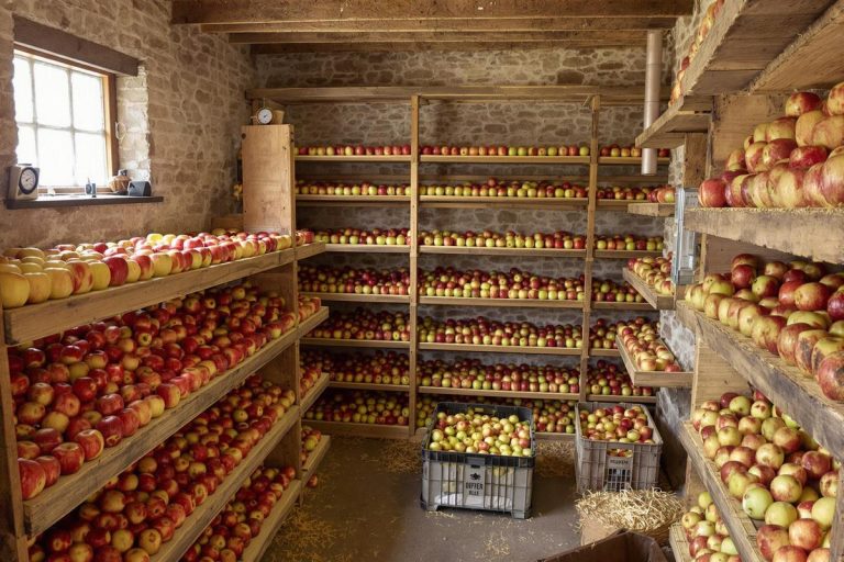 Oublié les cartons empilés pleins à craquer. Le vrai truc, c’est de poser les pommes sur des clayettes — ces étagères en bois ajouré. L’air circule bien, l’humidité ne s’accumule pas, et vous pouvez contrôler les pommes d’un coup d’œil. L’idéal pour repérer une pomme suspecte avant qu’elle ne contamine les autres.